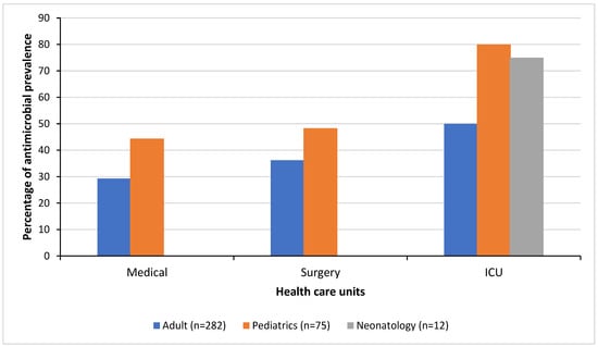22]). However, there was a wide variation in the prevalence between the different healthcare units within the hospital, suggesting major differences in clinical practice. The prevalence of antimicrobial use in patients reached 55 to 80% in some units, including the adult ICU, pediatric ICU, and pediatric surgical ward. This variation could be attributed to several factors, including a higher rate of bacterial infections among specific population groups, problems with increased prevalence of healthcare-acquired infections (such as intravascular device-related and surgical site infections) in these healthcare units, and the differing implementation of effective AMS and infection prevention and control measures between the different healthcare units.