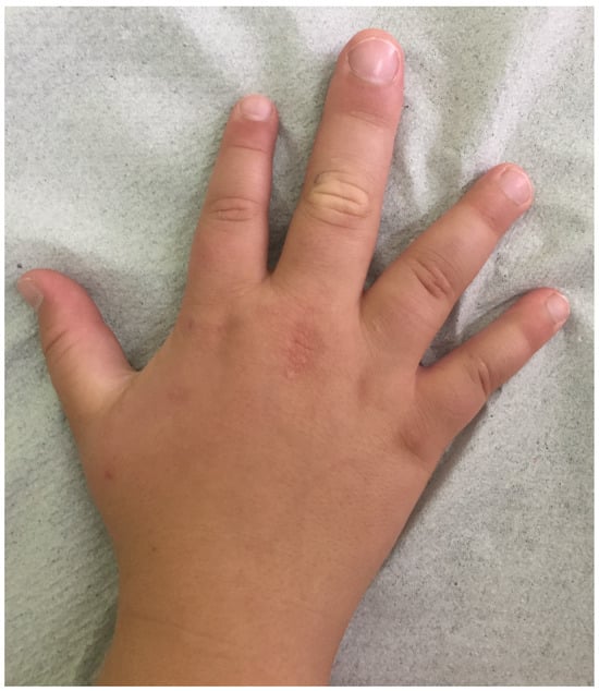 https://www.equator-network.org/reporting-guidelines/care/; accessed on 17 February 2025), we report that his prenatal history was unremarkable. However, his mother has bipolar disorder, migraines, and microcephaly (otherwise phenotypically normal) and gave birth to him at age 40. He was delivered full-term, with a normal birth weight and no early health concerns reported. Clinical evaluation revealed macrodactyly of the middle finger on his right hand, multiple epidermal nevi, and three lipomas on his trunk, as well as kyphoscoliosis, wide nostrils, an open mouth, and obesity (weight and body mass index at the 99th percentile for age and sex). Investigations for his heart murmur returned negative results for cardiac pathology. Regarding psychomotor development, the adolescent was found to have a low average intelligence quotient (86), with a history of slight delays in walking, significantly delayed speech, and one additional year spent in elementary school. Despite receiving special therapies for over ten years, he still exhibits some abnormal fixations. He can now talk and read simple texts or maps well but struggles with writing, numbers, and social skills. Overall, his medical history was inadequately documented, with noted gaps.
