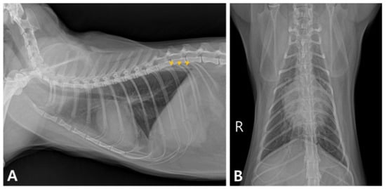 The complete blood count was within the reference interval. Serum biochemistry revealed an elevated blood urea nitrogen level of 44 mg/dL (reference range: 16–36 mg/dL), hyponatremia (146 mmol/L; reference range: 149–157 mmol/L), and hypochloremia (106 mmol/L; reference range: 117–127 mmol/L). Thoracic radiography revealed a mild bronchointerstitial pulmonary pattern and retraction of the caudal lung lobes from the thoracic wall (