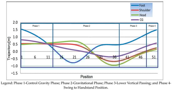 According to the model, the execution of this element takes 1.1 s, with 52 positions analyzed for each gymnast. The starting positions of the gymnasts were normalized to a single point.