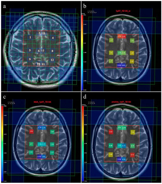 In total, about 4800 spectra were analyzed. We calculated the ratios of metabolites NAA/Cr, Cho/Cr, and mI/Cr from the Leonardo workstation (
