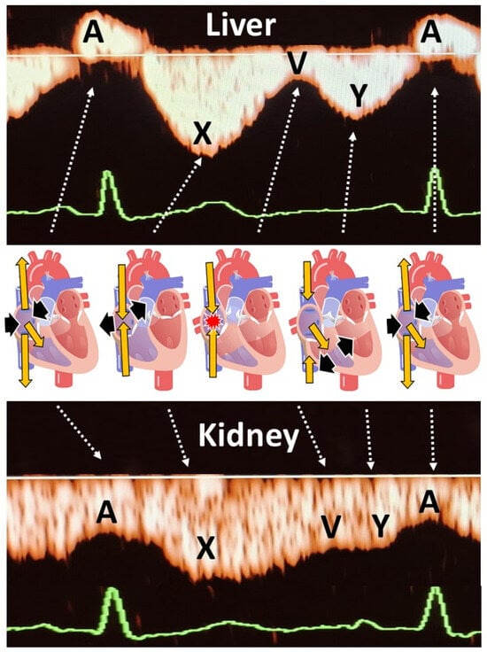 26]. A direct link between these cardiac features and venous hemodynamics and/or organ congestion have not yet been reported. Our case series shows that right ventricular dysfunction indeed is associated with abnormal venous Doppler flow patterns, and this enhances the vulnerability to organ congestion and dysfunction [
