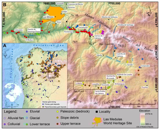 Figure 1A). Scientific research was mainly focused on the archaeological and mining study of one of the largest Roman mining complexes of international relevance, the gold mine of Las Médulas [