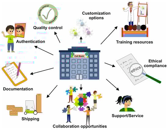 Overview of the services that a cell bank should provide. A cell bank should offer various cell types from different species, such as primary cells, immortalized cell lines, and stem cells, tailored for specific applications. In addition, a cell bank should offer consultation, relevant information, and a range of support services to researchers.
