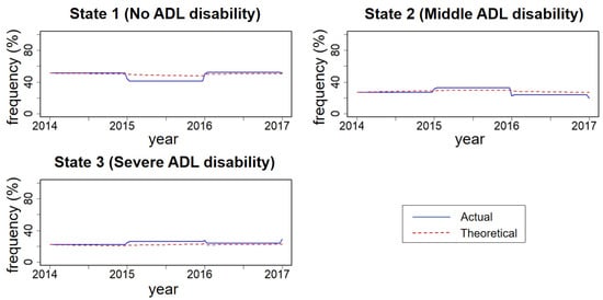 19]. The plot function of R 4.3.2 was utilized to illustrate actual and theoretical frequency percentage curves for each state, evaluating the fit of the multi-state Markov model [