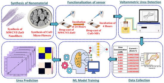 This study aims to pioneer the development of an ML-assisted, flexible, electrochemical, non-enzymatic biosensor for precise urea concentration detection. Leveraging a novel MWCNT-ZnO nanocomposite functionalized with CuO-MFs, we seek to enhance sensitivity and operational performance, addressing key challenges faced by traditional biosensors. Our comprehensive evaluation incorporates various characterization techniques and electrochemical CV analysis to validate the biosensor’s effectiveness. Furthermore, by integrating advanced ML models to predict urea concentrations from experimental data, we enhance the sensor’s accuracy and reliability. This research not only demonstrates the transformative potential of ML in sensor technology but also paves the way for innovative applications in clinical diagnostics, environmental monitoring, and food safety. The findings of this study hold significant promise for advancing biochemical sensing technologies, ultimately contributing to improved health outcomes and more effective monitoring of urea levels in diverse settings.