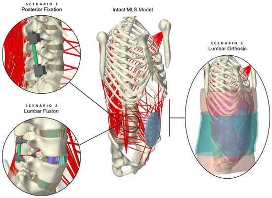 The aim of this study is, therefore, to illustrate a novel model for predicting in vivo-like loading conditions of the lumbar spine treated conservatively or surgically with medical devices. For this purpose, a previously validated intact hybrid FE–MB spine model [74] was modified in three exploratory scenarios, fitted with implants or an orthosis. The model validity was evaluated for different physical activities, including a comparison with data from the literature for the biomechanical responses of the FE and MB components, as well as the internal loads on the spinal implants. As the entire model was muscle-driven, the stabilization mechanisms of the muscle forces were also evaluated and passive minimal models without muscle influence were extracted and validated in advance.