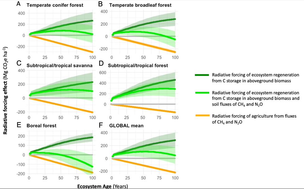- Regenerating forests typically absorb small amounts of methane but release enough nitrous oxide to create a net warming effect from these two gases combined