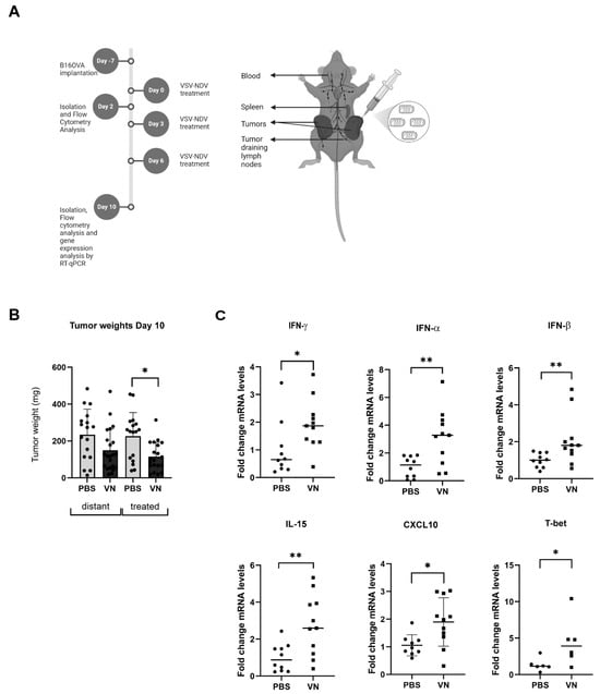 Tumor tissue was collected and homogenized using a Precellys lysing kit (Bertin Technologies, Montigny-le-Bretonneux, France). RNA was isolated using a Maxwell RSC SimplyRNA tissue kit (Promega, Madison, WI, USA) and the Maxwell RSC instrument (Promega). GoTaq 1-step RT-qPCR Kit (Promega) and a 7500 Real Time PCR system (Applied Biosystems, Foster City, CA, USA) were used to assess transcript abundance. Samples were quantified in duplicates using 50 ng of template RNA and the following cycling conditions: reverse transcription (RT) at 50 °C for 15 min; reverse transcriptase inactivation/hot-start polymerase activation at 95 °C for 10 min, followed by 40 cycles of 95 °C for 15 s (denaturation), 60 °C (IFN-γ, IL-15, T-bet, IFN-β, and GAPDH) or 53 °C (CXCL10) for 30 s (annealing), and 72 °C for 30 s (extension). GAPDH was used as a housekeeping gene for normalization, and the comparative ΔΔC
