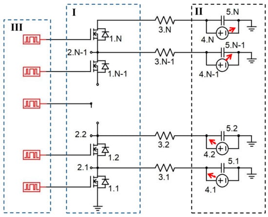 On the contrary, for a conventional stack (with a single load RL) under the corresponding voltage N∗E, the current IT1 is N∗E/RL, i.e., it is (N + 1)/2 times smaller than in Equation (3). Multipliers of order (N + 1)/2 are a disadvantage of the new technical solution. Therefore, the application area of the proposed concept is most likely not industrial electronics. The field of high-speed instrumental applications with their relatively low operational currents and significant demands on the quality of functional performance is promising.