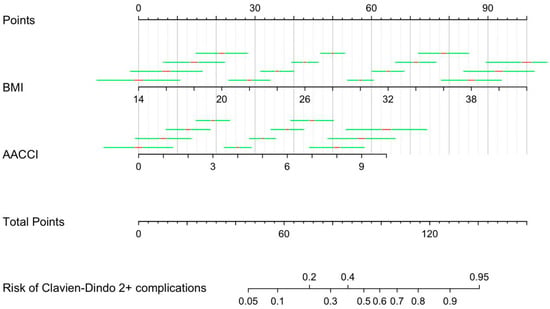 p < 0.05 were selected for nomogram construction. Variables were represented in the nomogram as line segments with varying lengths according to weight, with scores ranging from 0 to 100. The total score predicted the risk of Clavien–Dindo 2+ complications.