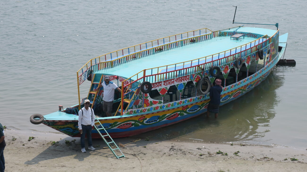 After a good night’s sleep, we headed to the Jamuna River. The river is braided, meaning that in the dry season it consists of many crisscrossing channels and sandy islands called chars. During the increased flow of the monsoon, it is almost all water, 3-6 miles across. Still, over 700,000 people live on the chars, farming and raising cattle during the dry season. Some live there year round, while others only seasonally. In this dynamic river, the chars are always shifting, and people have to move on average every 10 years.