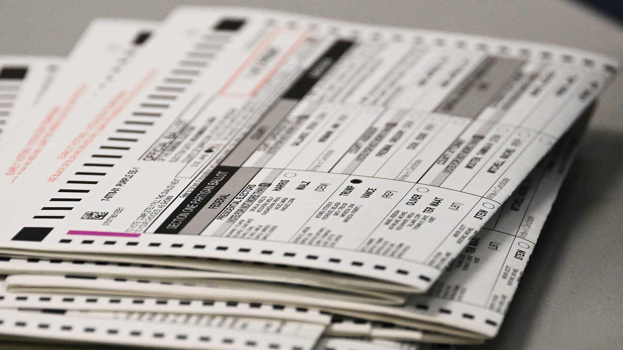 A ballot marked for Trump sits on a stack of completed ballots inside the Maricopa County Tabulation and Election Center on November 5 in Phoenix.