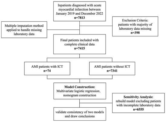 This study has several limitations. First, although our sample size of 7415 AMI patients is substantial, it is confined to a single center, which may limit the generalizability of the findings. Second, the ICT incidence rate of 1% is lower than that reported in other studies (5–8%) [35,36]. This may be due to the lack of recent prevalence data as well as advancements in treatments that reduce ICT incidence. Moreover, as a leading medical center in Northwestern China, our center’s timely interventions have significantly lowered complication rates. Additionally, the retrospective design introduces potential selection and information biases. Future larger-scale multi-center studies are needed to validate these findings and address regional variations. Despite these limitations, this study is the first to investigate ICT risk factors in AMI patients, filling a significant gap in research.