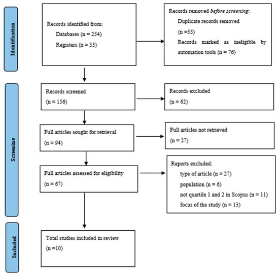 In the first round of screening, 94 full-text articles were sought for retrieval, of which 27 could not be retrieved. The remaining 67 articles were assessed for eligibility. Exclusion occurred for several reasons: 27 articles were excluded due to the type of article, 6 due to population focus, 11 because they were not published in journals indexed in Q1 and Q2 of the SCOPUS database, and 13 due to the study’s focus not aligning with the criteria.