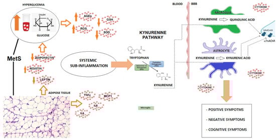 Patients with schizophrenia frequently present with comorbid MetS, with a prevalence exceeding 40% [9]. This association is linked to systemic low-grade inflammation driven by visceral obesity, hormonal dysregulation, and increased pro-inflammatory cytokines [4,9,10,11,12]. MetS correlates with greater cognitive impairment in schizophrenia [2,44], potentially due to enhanced neuroinflammation, oxidative stress, cytotoxicity, white matter (WM) disruption, and microglial activation [5,6,13,14,15,45,46]. All these pathogenic elements have a negative impact on the cognitive outcome. Indeed, patients with MetS exhibit lower cognitive performance across multiple cognitive domains [2,44]. Interestingly, the relationship between individual MetS components and cognitive impairment in schizophrenia is well documented [44,47], though with small effect sizes [48]. Reverse causality is possible, where cognitive deficits, but also negative symptoms, may contribute to MetS through socioeconomic disadvantage, unhealthy lifestyles, less access to healthcare, carelessness, and sedentary behavior [49]. Second-generation antipsychotics, known for inducing weight gain and metabolic abnormalities, further compound MetS risk [50]. Indeed, Mitchell and colleagues compared un-medicated patients, first-episode psychoses, and patients on stable antipsychotic treatment and found that the prevalence of MetS drastically increases if antipsychotics are prescribed [51]. The KP may mediate the link between systemic inflammation and cognitive decline through neuroactive metabolites, which are formed under inflammatory conditions [5]. Some findings suggest a relationship between MetS and pharmaco-resistance, although the causal link may be bidirectional, as refractory symptoms are typically treated with higher doses of antipsychotics, particularly clozapine, which is associated with significant weight gain, dyslipidemia, and glucose intolerance [50]. Conversely, the pro-inflammatory state induced by MetS and subsequent activation of the KP may partially explain the more severe refractory symptoms observed in treatment-resistant schizophrenia (TRS). As a matter of fact, obesity, altered metabolism, and systemic low-grade inflammation correlate with an increased KYN/Trp ratio, reflecting greater Trp catabolism through the KP and elevated levels of its metabolites [52,53,54,55,56]. Therefore, peripheral inflammation driven by the dysmetabolic state may lead to enhanced concentrations of KYN in the brain through inter-organ crosstalk involving adipose tissue, skeletal muscles, the gut, and the CNS [55,56,57].