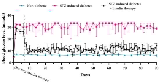 Subsequently, the insulin dose was adjusted to 6–7 IU per day, depending on the glycemic levels. For further studies, an STZ dose of 45 mg/kg was selected, as insulin therapy for STZ-induced diabetes at this dose resulted in more stable and controlled blood glucose levels compared to insulin therapy for diabetes induced with an STZ dose of 65 mg/kg.