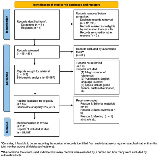 To ensure comprehensive coverage of core research in green finance, we applied a systematic literature search in Web of Science using the following keywords: “green finance”, “green insurance”, “green securities”, and “green investment”. Our search focused on studies published between 2014 and 2023 to capture recent research developments. The included document types were primarily academic journal articles and conference papers, restricted to original research and review articles.