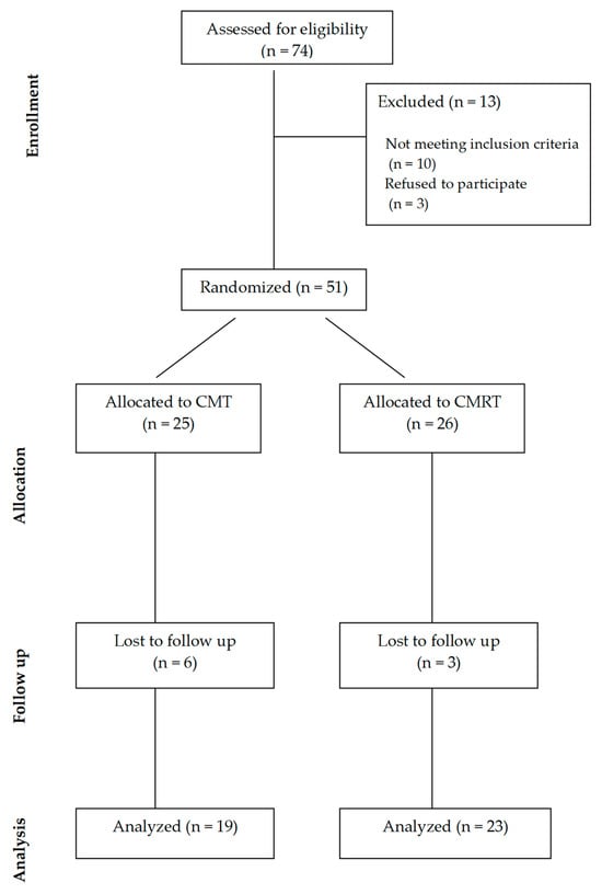 The exclusion criteria were having any infection, neoplastic illness, or cardiopulmonary, vascular, inflammatory, immune, or other musculoskeletal condition, having undergone total or partial knee replacement, having received physical therapy in the previous six months, having taken NSAIDs in the previous three days, having received intra-articular injections of corticosteroids or hyaluronic acid in the previous six months, or having received oral or local corticosteroid or anticytokine or any biological therapy. A total of 51 patients were included in the study after meeting the eligibility criteria, with 26 of them receiving the controlled mud therapy (CMT) intervention and 25 receiving controlled mud fortified with RosA (CMRT) therapy. Nine patients were lost to follow-up, leaving forty-two patients for evaluation (