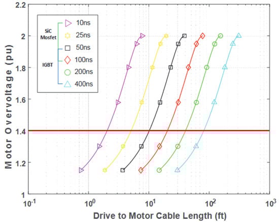 Figure 22. As is expected, based on overvoltage theory, tests with a 20 ns rise time experience noticeably increased stress across all test points when compared to equivalent tests with a 100 ns rise time. This clearly illustrates the increased stress placed on insulation by SiC operation when compared to Si operation for all test cases, thus necessitating the adaptation of stress prediction methods to account for a change from Si to SiC.