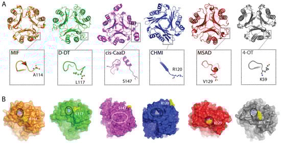 Previously published studies on the TSF human members, MIF and D-DT, showed that the C-terminal region has a multi-tiered role associated with the structure and function of these proteins [14,16,17,34,35,36]. Having these two proteins as our benchmark, we probed for broader insights into this superfamily. While interrogation of over 11,000 proteins is unrealistic, we selected representative members based on a previously published sequence similarity network (SSN) analysis that partitioned the TSF proteins into five families; MIF, cis-CaaD, MSAD, CHMI, and 4-OT [1].