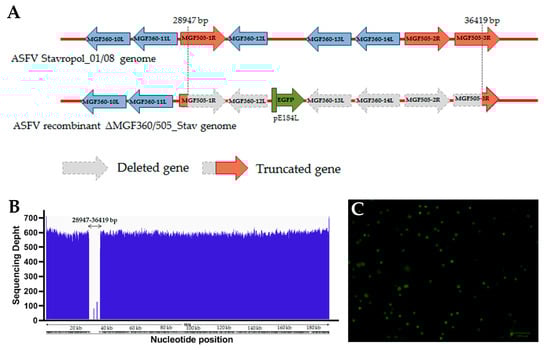 Due to these facts, we decided to also use the deletion of these genes for the production of LAV against ASFV genotype 2 isolates circulating in Russia. We used the Russian ASFV Stavropol_01/08 strain (genotype II, serotype 8) as a backbone to generate a recombinant virus. Comparative complete genome analysis of the recombinant ΔMGF360/505_Stav and the parental Stavropol_01/08 strains confirmed the deletion of the multigene family MGF360/505 genes and the simultaneous insertion of the EGFP gene with the E184L gene promoter. In addition, we found few point mutations (insertions and deletions) in the poly-C and poly-G regions. Due to the fact that the mutations in the poly(C) and poly(G) regions are difficult to confirm by both Illumina and Sanger sequencing, we cannot say that these mutations are related to the recombinant strain production and are not sequencing errors.