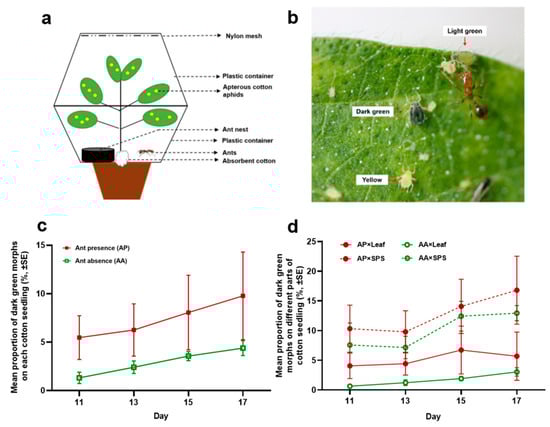 50]. Therefore, the results of the present study suggest that cotton aphids may be able to take advantage of ant protection as a favorable condition by distributing on nutrient-rich parts of plants, thereby producing larger, faster-growing, and more fecund phenotypes to satisfy the ants’ demand for honeydew and to compensate for the costs from mutualism.