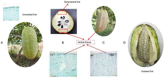 19]. However, our approach was more comprehensive, sampling both the ventral suture and the dorsoventral line simultaneously to provide a comparative view of changes occurring in fruit structure. This dual sampling provides a broader understanding of fruit cracking mechanisms. Such comprehensive sampling allows for a more detailed exploration of the structural and physiological changes associated with fruit cracking, which is crucial for improving fruit quality and marketability. The research findings emphasize the dynamic changes in cell wall components and enzymatic activities during fruit ripening, highlighting their critical roles in the cracking process.