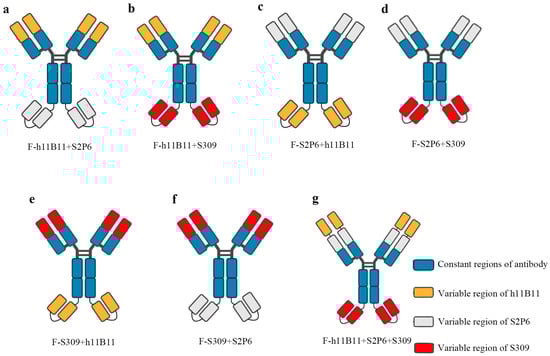 To determine the neutralization activity and protective efficacy at the cellular level of all recombinant antibodies, we carried out neutralization tests with various SARS-CoV-2 pseudovirus subvariants, such as Wuhan, Beta, Delta, BA.2, BA.5, and XBB. The half-maximum inhibitory concentration (IC50) values were calculated, and the one-way ANOVA was conducted to assess whether there was significant difference among the antibodies to the different subvariants. The one-way ANOVA results indicated significant difference with the p < 0.0001. The recombinant trispecific antibody exhibited superior neutralization activity and broad protective efficacy compared to other bsAbs and native monoclonal antibodies (p < 0.0001), with IC50 values ranging from 5 to 27 ng/mL for different subvariants, which are significantly lower than those of other recombinant antibodies (Figure 3a–f). Among bispecific antibodies (bsAbs), F-S309 + S2P6 demonstrates superior and broader efficacy compared to others against various SARS-CoV-2 subvariants (p < 0.0001), with IC50 values of 8, 14, 43, 32, 85, and 23 ng/mL, respectively (Figure 4a–f). The bsAbs F-S2P6 + S309, F-h11B111 + S309, and F-S309 + h11B1 exhibit a broader protective spectrum against diverse subvariants. The IC50 of the bsAb F-S2P6 + S309 is 10, 27, 50, 104, 112, and 32 ng/mL against different subvariants (Figure 4a–f). Meanwhile, the IC50 of the bsAb F-h11B11 + S309 is 19, 73, 30, 130, 150, and 73 ng/mL, respectively (Figure 4a–f). And the F-S309 + h11B11 shows a similar trend as the previous bsAbs, with IC50 values of 15, 41, 20, 137, 116, and 64 ng/mL (Figure 4a–f). However, they do not present lower IC50 values compared to F-S309 + S2P6. The bsAbs F-h11B11 + S2P6 and F-S2P6 + h11B11 do not exhibit a similar tendency to other bsAbs (Figure 5). Although F-S2P6 + h11B11 possesses a good neutralization activity against Wuhan and Beta subvariants with IC50 values of 43 and 60 ng/mL (Figure 4a,b), its efficacy is not equivalent against the Delta, BA.1, BA.5, and XBB, which are classified as variants of concern (VOC), with the IC50 values of 333, 358, 327, and 591 ng/mL, respectively. The bispecific antibody F-h11B11 + S2P6 displays a distinctive characteristic in its neutralization profile, with the weakest activity observed against the XBB variant, reflected by an IC50 value of 684 ng/mL (Figure 4f). In contrast, the IC50 values for its neutralizing activity against the other variants are 283, 283, 374, 409, and 372 ng/mL, respectively (Figure 4a–e). Generally speaking, the bsAb F-h11B11 + S2P6 demonstrates the least ideal neutralization activity among the evaluated bsAbs since its IC50 values against all subvariants are relatively higher than those of all other bsAbs. Compared to native monoclonal antibodies S2P6 and h11B11, all these bsAbs display better neutralization activity with lower IC50 values (p < 0.0001), indicating a superior protective efficiency compared to native monoclonal antibodies (Figure 5). S309 exhibits a different scene. The bsAb F-S2P6 + S309, F-h11B111 + S309, F-S309 + S2P6 and F-S309 + h11B11 show a better neutralization activity than S309 against all subvariants with much lower IC50 values. Meanwhile, the bsAb F-S2P6 + h11B11 merely exhibits lower IC50 values against the Beta and BA.5 subvariants in comparison to S309. The bsAb F-h11B11 + S2P6 possesses a superior neutralization activity with lower IC50 values exclusively against the BA.5 subvariant. Additionally, in contrast to the original monoclonal antibody S309, F-h11B11 + S2P6 shows an inferior neutralization activity against other subvariants with significantly higher IC50 values.