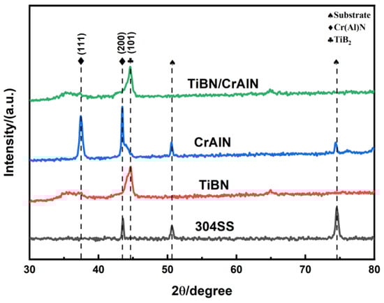 16] employed cathodic arc ion plating technology to deposit TiN, CrN, CrAlN, and TiAlN coatings on 304 stainless steel and investigated the corrosion behavior of these coatings in a corrosive medium consisting of 3.5% NaCl solution. The results indicated a significant positive shift in self-corrosion potential for all four coated samples compared to the 304 stainless steel substrate. Electrochemical impedance spectroscopy revealed that compared to similar nitrides formed via magnetron sputtering techniques, the deposited layers exhibited enhanced abilities against defect propagation and pore expansion when immersed in 3.5% NaCl solution. The addition of B elements in CrN-based coatings has become another focal point of research. However, single-layer coatings tend to grow continuously during the deposition process, which can lead to a columnar structure, allowing corrosive media to easily penetrate the coating material and even corrode the substrate, significantly reducing the corrosion resistance of the coating. To address this challenge, designing multilayer structures presents an effective method for enhancing both corrosion resistance and wear performance. Since the preparation process of multilayer coatings involves alternating deposition, differences in thermal expansion coefficients or lattice constants between different layers can result in dislocation stacking at the interfaces, which can hinder the formation of columnar structures within any given layer [
