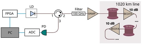 Schematic of the custom OTDR device. LD—laser diode; FPGA—field-programmable gate array; VAMP—variable bidirectional optical amplifier; PD—optical photodetector; ADC—analog-to-digital converter; BEDFA—bidirectional optical erbium-doped fiber amplifier; PC—personal computer.