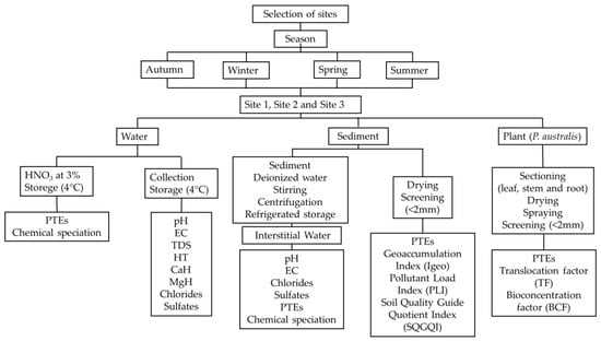 6]. Different chemical forms of these metal(loid)s can bind to sediments or mobilize to water under specific chemical and physicochemical conditions. The chemical interactions between aquatic systems and PTEs are complex, causing environmental changes at different levels of the food chain. The complexes formed with PTEs in sediments and water depend on changes in pH, potential redox, chemical species, and temperature [
