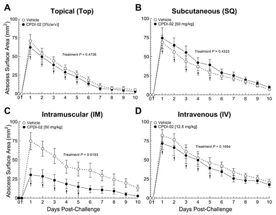 45]. Repeat treatment: Vehicle alone or vehicle containing the indicated dose of CPDI-02 or inactive scCPDI-02 was administered (n = 10 mice) at 6 h post-challenge, then daily over 5 days starting at 24 h post-challenge (6, 24, 48, 72, 96, and 120 h post-challenge) by the indicated administration route (6 treatments total). For IM (left caudal muscle) and SQ (left flank) administration, CPDI-02 was administered in 0.050 mL of sterile PBS [20 mg/mL] (volume adjusted to 50 mg/kg dose). For topical administration (TOP), CPDI-02 was applied to abscesses in 0.100 mL of ointment (3%
