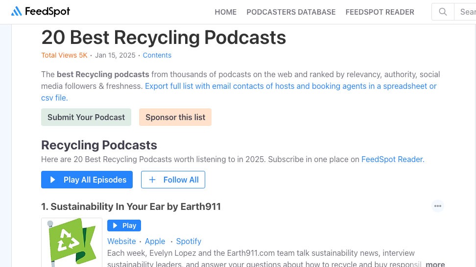 Feedspot, a content aggregation and discovery platform that helps users follow their favorite blogs, websites, news sources, YouTube channels, and podcasts, has named Earth911’s Sustainability In Your Ear the #1 recycling and #2 sustainability podcast worth listing to in 2025. There are a lot of great programs to choose from in both categories, and we’re honored to be recognized. Please take a moment to share the show with your friends, family, and anyone else who you think would benefit from joining the conversation. We’ve just entered our fifth season and recently released our 500th program, an interview with Bad Naturalist author Paula Whyman.