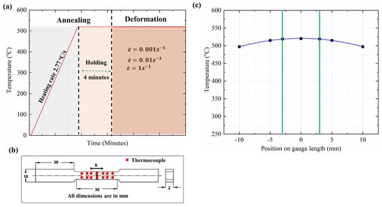 Figure 1c shows the temperature distribution profiles at various positions on the sample. The temperature at the center of the sample was 520 °C, while the readings at the ±3 mm, ±5 mm, and ±10 mm positions were 519 °C, 514 °C, and 497 °C, respectively. The temperature varied only 1 °C at the ±3 mm position; as a result, the uniform temperature zone was identified as the 6 mm center region of the sample, which was chosen as the gauge zone for tensile elongation measurements. During tensile testing, only one thermocouple was spot-welded to the sample center to monitor and control the test temperature. The tensile tests were repeated three times for each condition to ensure reproducibility and consistency.