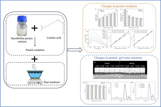 Therefore, grass carp MP was studied in this paper, and the heat treatment was applied following OLA-induced MP oxidation to investigate the impact and possible mechanisms of the heat treatment on the oxidation of grass carp MP. The changes in MP oxidation, thermal aggregation, and gel properties were analyzed by measuring the carbonyl and sulfhydryl contents, surface hydrophobicity, solubility, and WHC. The results may contribute to a deeper understanding of the oxidation mechanisms of MP under the dual influence of heat treatment and OLA oxidation, providing scientific guidance for protein protection and quality control during the heat processing of fish.