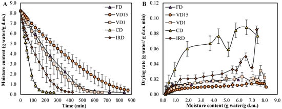 After the drying processes, the L* parameter of the dehydrated samples increased considerably compared to the fresh sample (p ≤ 0.05), with 73.57, 61.62, 62.96, 65.98, and 70.40 units for FD, VD15, VD1, CD, and IRD treatments, respectively. These results are in accordance with Keser et al. [6], who also reported an increase in luminosity after the drying treatment of carrots. The concordance of results can be accredited to the fact that the dehydrated products have much less water and therefore the light is reflected differently [55]. All drying methods produced a decrease in a* and b* parameters in comparison to the fresh sample, indicating a decrease in redness and yellowness of the dried carrot waste. The losses in redness and yellowness of carrot can be strongly related to the decomposition of their carotenoids, flavonols, flavones, and isoflavones [22]. In particular, the IRD treatment showed the lowest a* and b* values among all samples (p < 0.05), which can be explained by the fact that exposure to radiant light exposure promotes the isomerization of carotenoids and their degradation [2]. The difference in ΔE* values of dried carrot waste was significant (p < 0.05), ranging from 15.55 to 34.39. This indicates that the drying process caused a visible color difference compared to fresh waste, as a ΔE* value greater than 3.5, according to the International Commission on Illumination (CIE), signifies a noticeable color change [56]. Among the dried samples, both IRD and FD presented the highest ΔE*. This is explained by the increase in L* and the reduction of b* and C*ab, meaning a lighter overall color and less vibrant orange. In fact, the higher h°ab and lower C*ab values in the IRD- and FD-dried samples confirmed that they turned more yellowish, while the VD15-dried carrot exhibited a more vivid orange character compared to the other dried samples. Although the VD15 sample has the lowest amount of carotenoids (Figure 4A), other pigments in carrots may have been enhanced by this drying method.