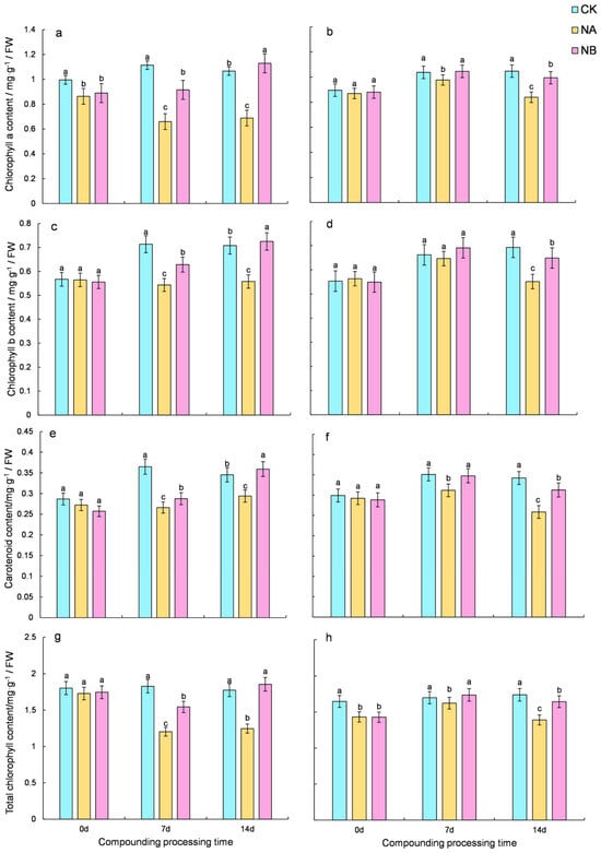 Figure 1g,h). Compared with the normal conditions (CK), the carotenoids content of the two tea varieties decreased by 27.11% and 11.13% at 7 days and 14.95% and 24.43% at 14 days, respectively. After NB treatment, both ‘FD’ and ‘CC’ varieties showed a significant increase in carotenoid content compared to that under salt stress at 7 days and 14 days, with increases of 8.14% and 11.43% for ‘FD’ and 22.26% and 20.96% for ‘CC’, respectively (