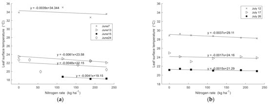 p-value < 0.05) negative correlation was identified between the crop surface temperature and applied nitrogen rate. However, surface temperature measurements showed variability due to external and weather-dependent factors that influence crop surface temperature.