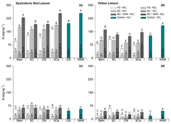59], which aligns with the results reported in this study. Soil type is a key factor influencing N availability in response to the different N sources tested. The use of biochars derived from chicken manure and shrimp carcass increased the availability of nitrate-N in the soil to levels even higher than those observed in treatments where N was supplied as ammonium nitrate. The two Oxisols examined in this study have different capacities to supply N for maize. The LVd (clayey Oxisol) was able to provide greater amounts of N than most feedstocks and their derived biochars when added to the medium-textured Oxisol (LVa). According to Morais et al. [