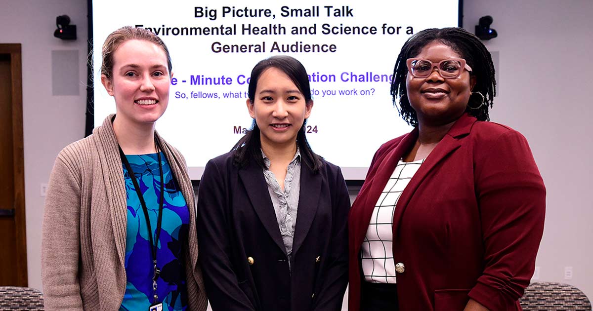 Fellows were challenged to explain in three minutes what their research entails, the broader impact of that research on science and society, and what they have personally gained from their experiences at NIEHS.