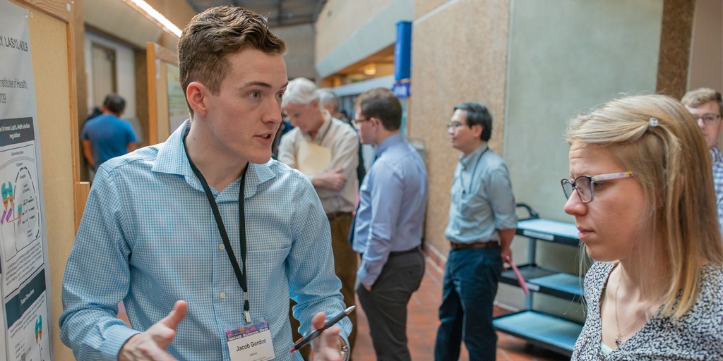 This five-minute time limit was a departure from a traditional poster session where presenters have more informal, one-on-one conversations with people who visit the poster. “I really stripped my poster down in terms of words and data … compared to what would have been hanging up at an in-person session,” Gordon said.