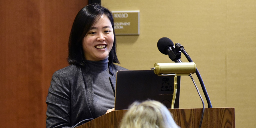 SRP Program Administrator Heather Henry, Ph.D., left, introduced Kim and moderated questions, which focused on how effects of cells may translate to animals and humans. (Photo courtesy of Steve McCaw)Combining disciplines to answer questions