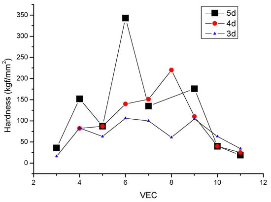 To start with, we would like to report on an interesting experimental fact: for single-phase metallic alloys, maximum hardness is attained when the VEC is around 6.5–7. This relationship has long been known for pure metals [
