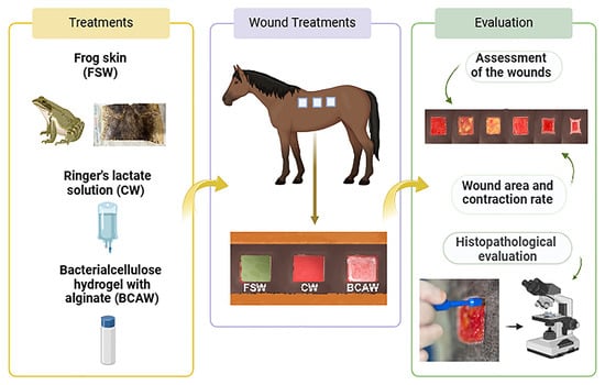 Frog skin dressings have also shown promising healing properties, attributed to their porosity, which facilitates oxygen flow while preventing liquid or exudate buildup in rabbits [22] and humans [23]. Despite these demonstrated pro-healing effects of BC and alginate-based dressings and frog skin in other species, this study did not observe such effects in horses.