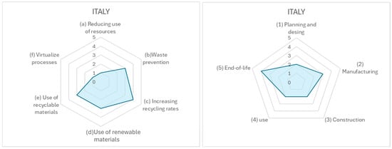 Figure 2, it is shown that the most diffused CE practices are the reduction of the use of resources, being implemented in all the analyzed documents, together with the promotion of the use of renewable/renewable materials. Virtualization practices are not fostered by any policy. When it comes to the construction value chain, there is a holistic thinking of the transition, since 5 out of 6 policy documents are considering all the phases of the value chain.