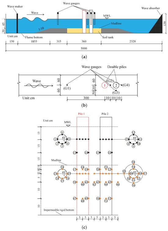 Schematic diagram of the experimental setup: (a) the side view of the wave flume; (b) plane view of wave flume and locations of wave gauges; and (c) location of wave pressure sensors and pore pressure sensors.