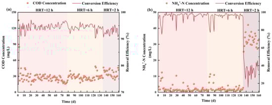 18]. During the entire experiment, the MBBR was consistently maintained at various HRTs of 12.0 h, 6.0 h, and 2.0 h, respectively, which corresponded to organic loading rates (OLR) of 1.0 kg Chemical Oxygen Demand (COD)/m