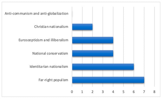 Campaign actions, rallies, and appeals to vote are the most represented topic in the videos viewed by most of the leaders, such as those of Austria, Belgium, Bulgaria, Slovakia, Slovenia, Italy, Poland, Portugal, and Romania, as well as for Marine Le Pen (RN), Kyriakos Velopoulos (EL/EΛ), Afroditi Latinopoulou (Foni Logikis), and László Toroczkai (Mi Hazánk). There are also other relevant issues for some politicians, such as security and immigration for the representatives of AfD (Germany), VB (Belgium), and CHEGA (Portugal); criticism of the political system or European institutions for the leaders of EL/EΛ (Greece), Mi Hazánk (Hungary), and Svoboda a přímá demokracie (Czech Republic); the appeal to traditional values for the leader of the Greek NIKI party; the narrative of crisis or decline for Slawomir Mentzen from Poland; and the rejection of progressive social movements for Morten Messerschmidt, candidate of Dansk Folkeparti. Other issues of varying content were included in the category of other issues, which are of interest to the leaders of Vox (Spain), Republika (Slovakia), Reconquête (France), Foni Logikis (Greece), KDNP (Hungary), and Fratelli d’Italia and Lega Salvini Premier (Italy).