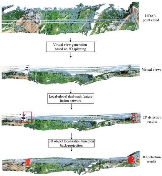 Airborne LiDAR point cloud data cover vast areas and contain large volumes of data, while the targets to be detected are notably small and sparsely scattered throughout the scene, occupying a minimal fraction of the overall area. To enhance detection efficiency without sacrificing the accuracy of TT detection, this paper proposes a fast TT detection method based on virtual views. Initially, the method computes the flight direction by analyzing the spatial extent of the LiDAR point cloud data. With the flight direction established as the x-axis and the elevation direction as the y-axis, a parallel projection matrix is created. This matrix projects the entire LiDAR point cloud onto a vertical plane in real-world coordinates, thereby generating a comprehensive virtual view. To overcome the challenge of detecting the small-sized TTs and potential omissions, this paper puts forth a local–global dual-path feature fusion network. This network extracts the two-dimensional coordinates of all TTs from the virtual view. Ultimately, the extracted two-dimensional positions are converted back into three-dimensional spatial coordinates within the LiDAR point cloud through the application of the projection matrix. The overall pipeline is illustrated in